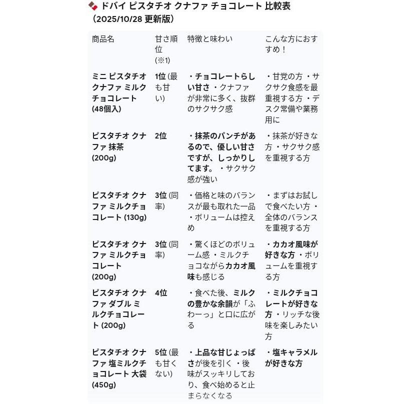 1951年より創業の226ヶ国に輸出を行ってらっしゃるドバイの老舗製造会社です。同じく販売している、22g48個入りのミニチョコもこちらの製造会社が製造しています。チョコの特徴は、他の製造会社と比べて、クナファーの量がかなり多いので、チョコを食べながら、サクサクしている食感が楽しめるのが特徴です。